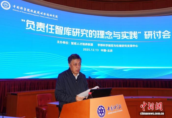 潘教峰研究员在“负责任智库研究的理念与实践”研讨会上致辞。中新网记者 孙自法 摄