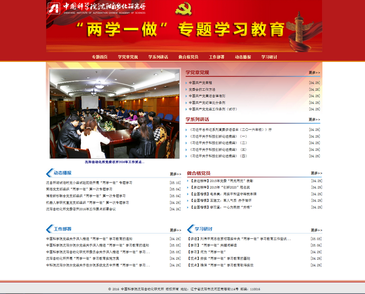 所网站开设了“两学一做”专栏,并放置在网站醒目位置。专栏内容丰富翔实,为党员进一步深入学习“两学一做”提供便捷渠道。党员可以通过专栏查看党章党规具体内容,与席大大系列讲话特别是其关于科技创新的论述内容,以及“两学一做”学习教育实施方案与相关通知;专栏及时更新研究所与各支部“两学一做”学习动态新闻;提供“两学一做”相关知识内容与评论文章供党员延伸学习;推出“身边榜样”与“全国楷模”事迹为党员树立学习榜样。