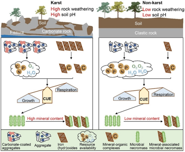 凯发k8亚热带农业生态研究所环江喀斯特生态系统观测研究站在喀斯特土壤微生物碳泵-矿物碳泵协同/权衡机制研究中取得进展。近期,相关研究成果以Lithological controls on soil aggregates and minerals regulate microbial carbon use efficiency and necromass stability为题,发表在《环境凯发k8与技术》(Environmental Science & Technology)上。