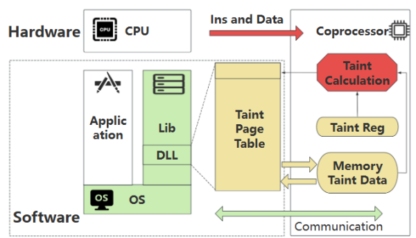 针对上述问题,研究团队提出了软硬件系统结合的多标签分析方案MulcoTaint。该方案基于CPU流水线和协处理器架构,将程序执行逻辑和数据流分析逻辑分离,并通过将数据流标签计算向量化,利用专用协处理器进行硬件加速。同时,团队在软件层面设计了配套机制,使其能够支持二进制/源码的字节级多标签数据流分析。