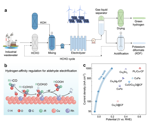 研究提出耦合阳极甲醛氧化的电解水制氢新策略,实现绿氢与高附加值化学品联产。研究构筑了Rh1Cu单原子合金催化剂。该催化剂在甲醛电氧化生成甲酸与氢气反应中表现出高的法拉第效率,并且具有超低过电位和超高电流密度,性能显著优于当前所报道的催化材料。构建的耦合电解系统实现双极产氢与高附加值化学品二甲酸钾的联产,展现出良好的工业应用潜力。
