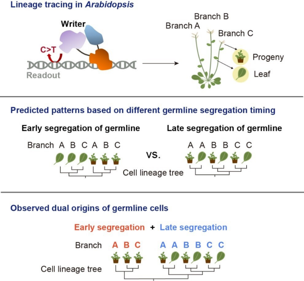 基于该细胞谱系树,研究团队发现拟南芥生殖系细胞存在两种分离模式:部分生殖细胞在花序分生组织形成过程中分离,另一些则在更早阶段,在分枝形成之前即已分离。后者类似于动物中的魏斯曼屏障,揭示了拟南芥中存在比现有认知更早期的生殖系分离过程。该发现为理解植物如何限制突变向后代传递、维持基因组稳定性提供了新证据。